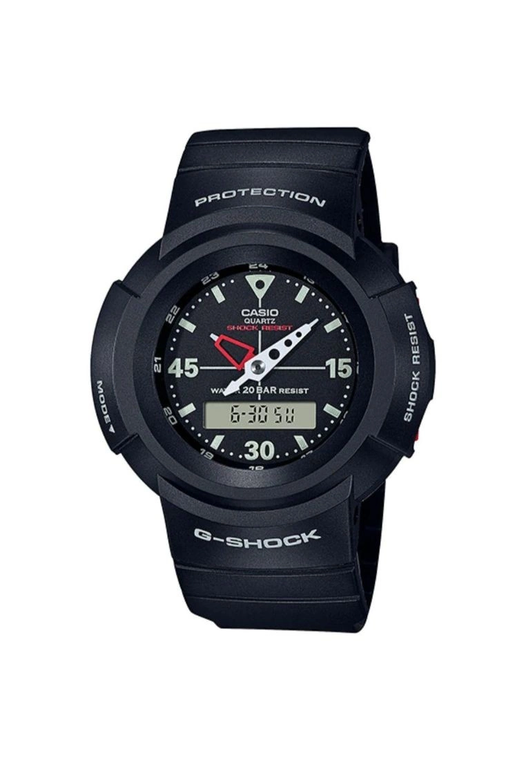 -The design of the original model, which had not been madedigital, provides blueprints for newly designed components. The variant handshapes, triangular marker, index, decorative letters and numerals, and othersuch features are reproduced faithfully.-Glass: Mineral-Case Material: Resin-Case Color: Black-Strap Material: Resin-Strap Color: Black-Movement: Digital, Analog-Function: 2 Hands, Digital & Analog-Local Warranty: 1 Year-Water Resistant: 200m-International Warranty: 1 Year-Case Size: 47.7mm