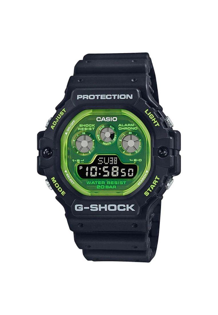 -Join the eternal G-SHOCK quest for the ultimate intoughness — now with timepieces that are a study in color and translucence.-The color revolution starts with an update of the precisionDW-5900, featuring a see-through luminescent dial with EL backlight for a palecool glow that consumes less energy.-From the latest street style to robust outdoor fashion,these colorful crossovers stand up to whatever your adventure is.-Glass: Mineral-Case Material: Resin-Case Color: Black-Strap Material: Resin-Strap Color: Black-Movement: Quartz-Function: Digital, Shock Resistant, Day & Date-Local Warranty: 1 Year-Water Resistant: 200m-International Warranty: 1 Year-Case Size: 46.8mm