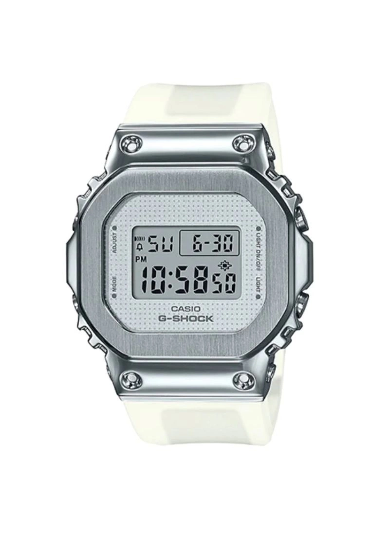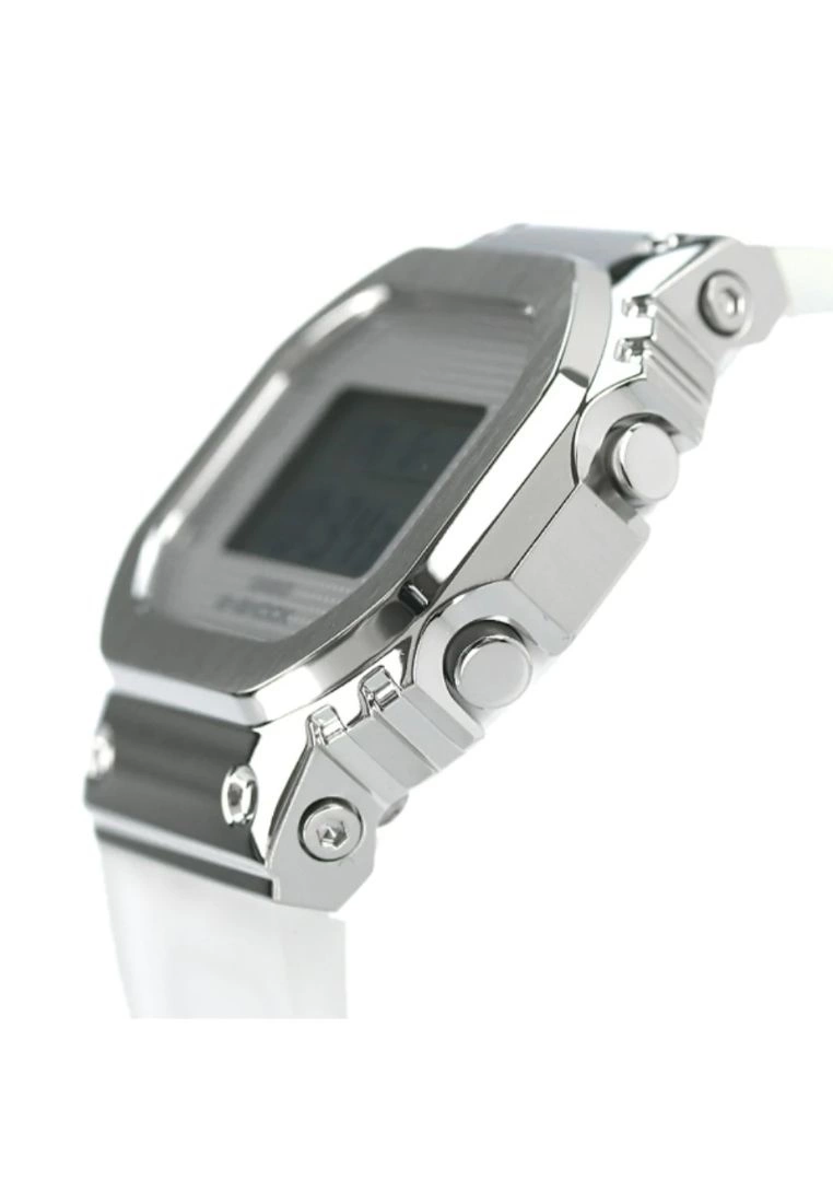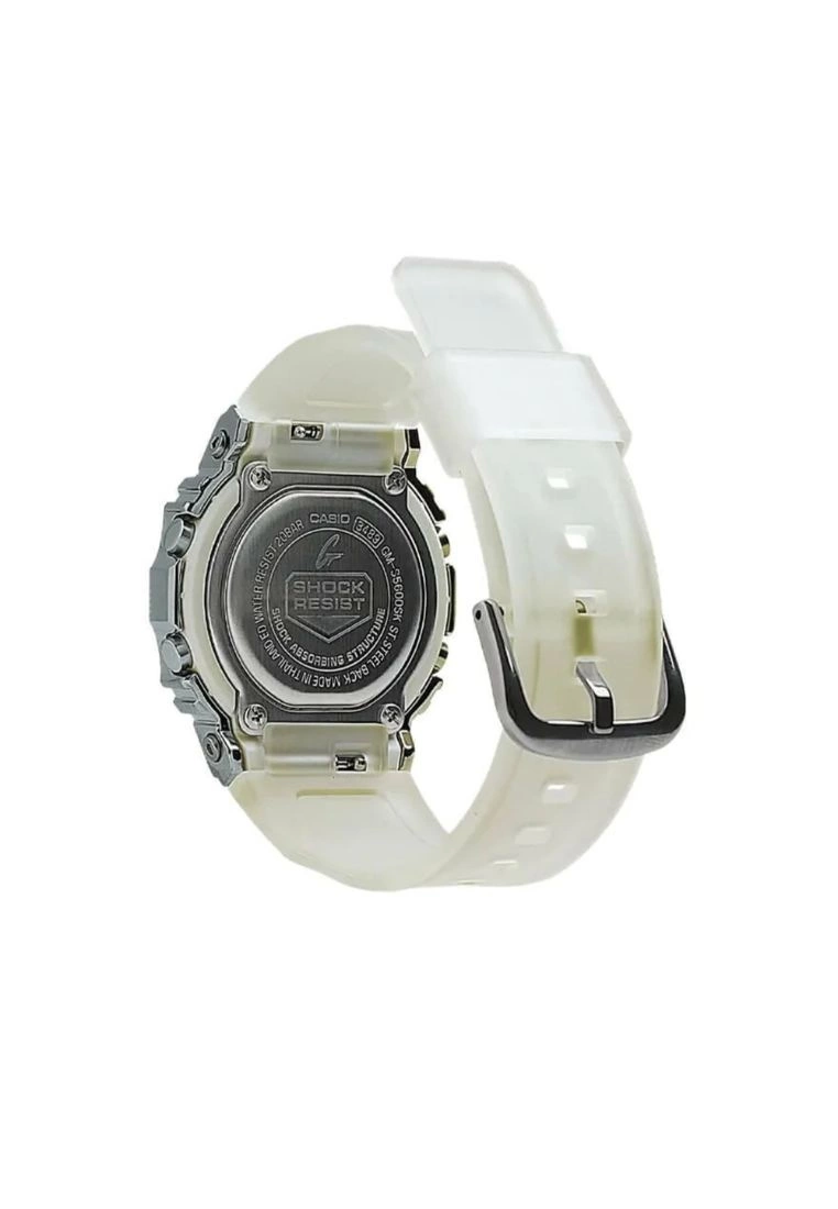 -These GM-S5600 models, which are smaller versions of theG-SHOCK GM-5600 Metal Covered Series, have been given a 1990s minimalistfashion look.-Two models are available: the white GM-S5600SK and theblack ion-plated (IP) GM-S5600SB.-The dial has a textured finish, while semi-transparentresin is used for the band.-Glass: Mineral Glass-Case Material: Resin-Case Color: Silver-Strap Material: Resin-Strap Color: White-Movement: Digital-Function: Digital, Shock Resistant-Local Warranty: 1 Year-Water Resistant: 200m-International Warranty: 1 Year-Case Size: 38.4mm