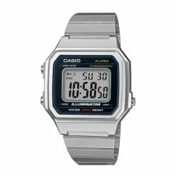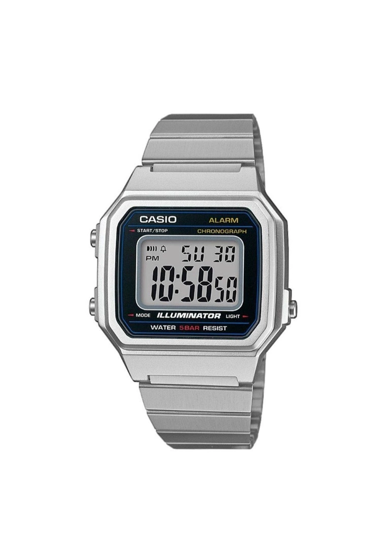 -Glass:Resin Glass-Case Material: Resin-Case Color: Silver-Strap Material: Stainless Steel-Movement: Digital Movement-Function:Large time digits, LED backlight, 1/100-second stopwatch, Daily alarm, Stainless steel band-Warranty: 1 Year
