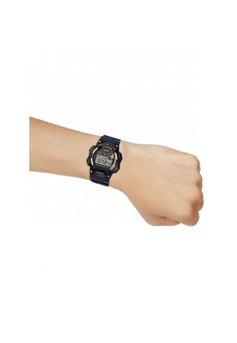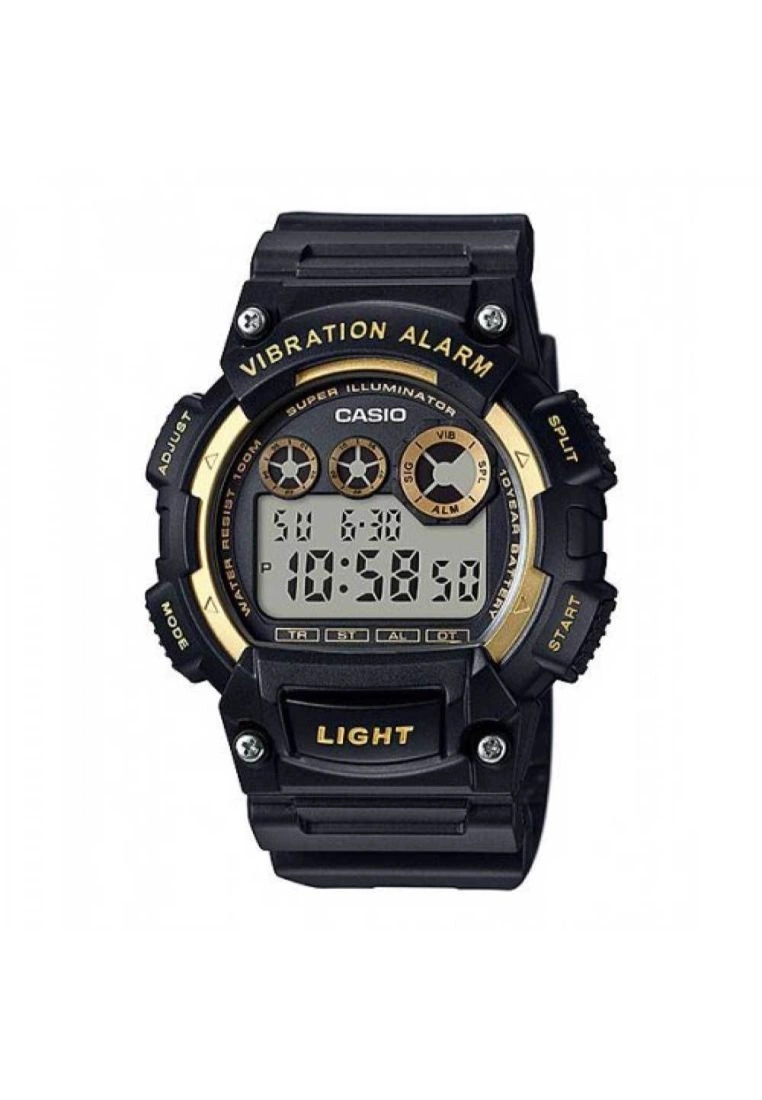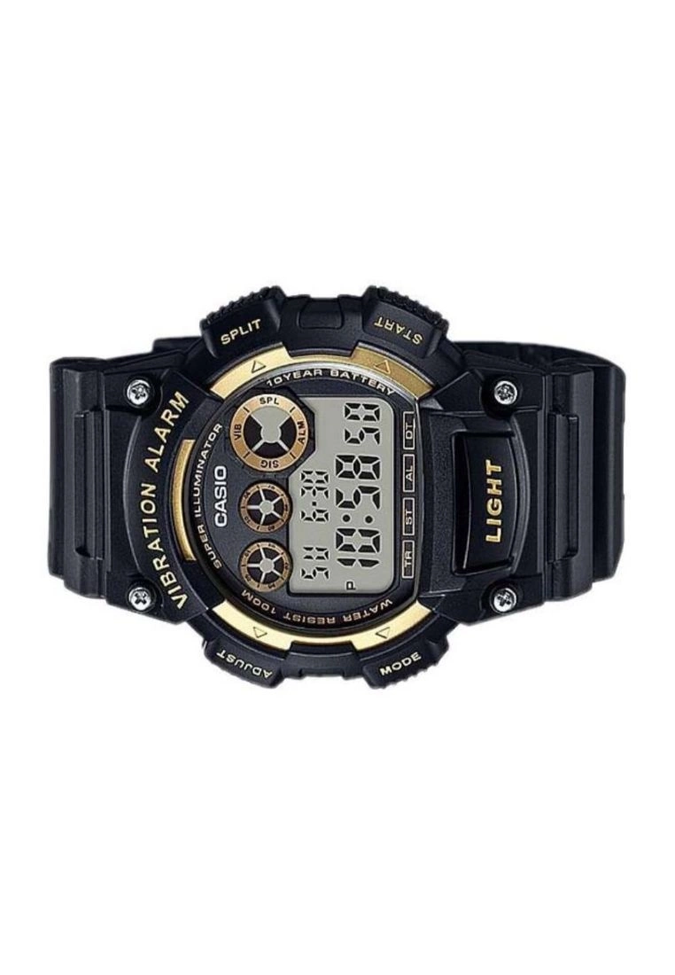 -Glass: Resin Glass-Case Material: Plastic-Case Color: Black/Gold -Strap Material: Resin Band-Movement: Digital Movement-Function: 1/100-second stopwatch, Vibration alarm, Super Illuminator, LED Light-Warranty: 1 Year